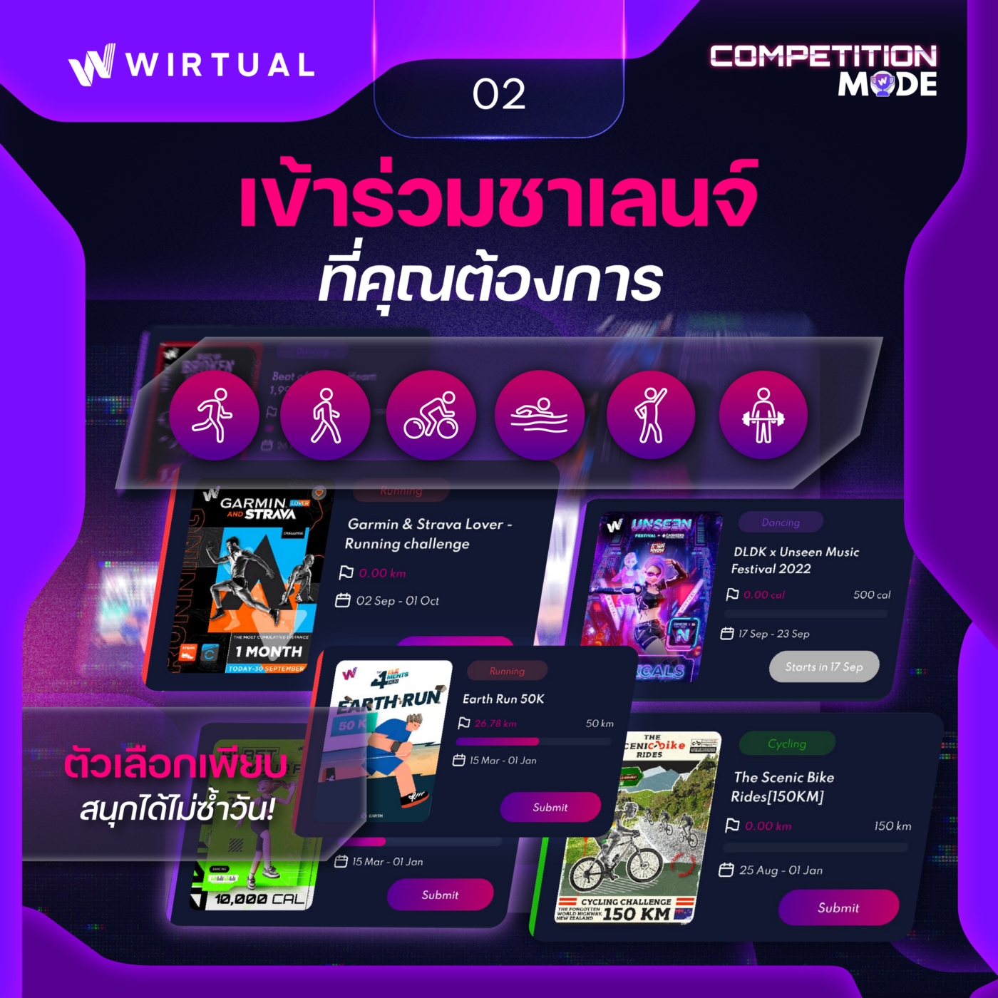 This includes 6 types of workout available for your selection. From running, walking, cycling, swimming, dancing to weight training. Competition Mode covers all your favorite ways to work out.