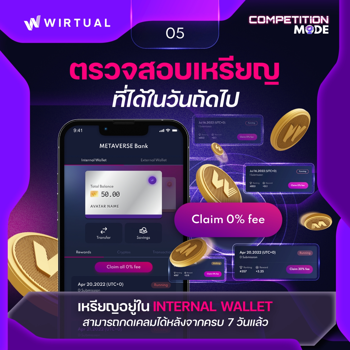 The $WIRTUAL you earned will be credited to your wallet at 00:00 (UTC+0) the following day. To claim a reward, claim fee will be charged for the first 7 days, starting at 30% and decreasing by 5% per day. After Day 7, there will be no additional charge required!