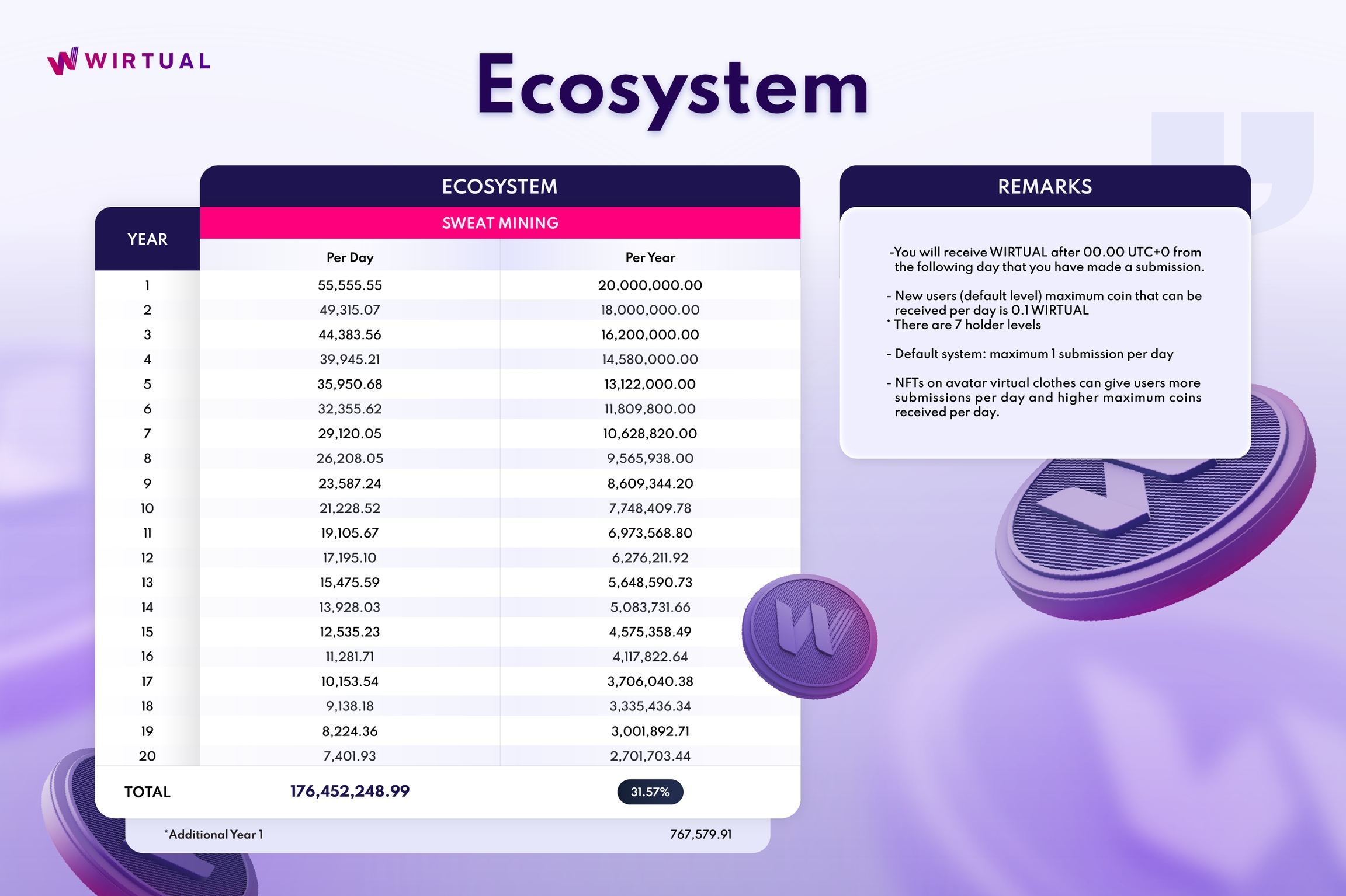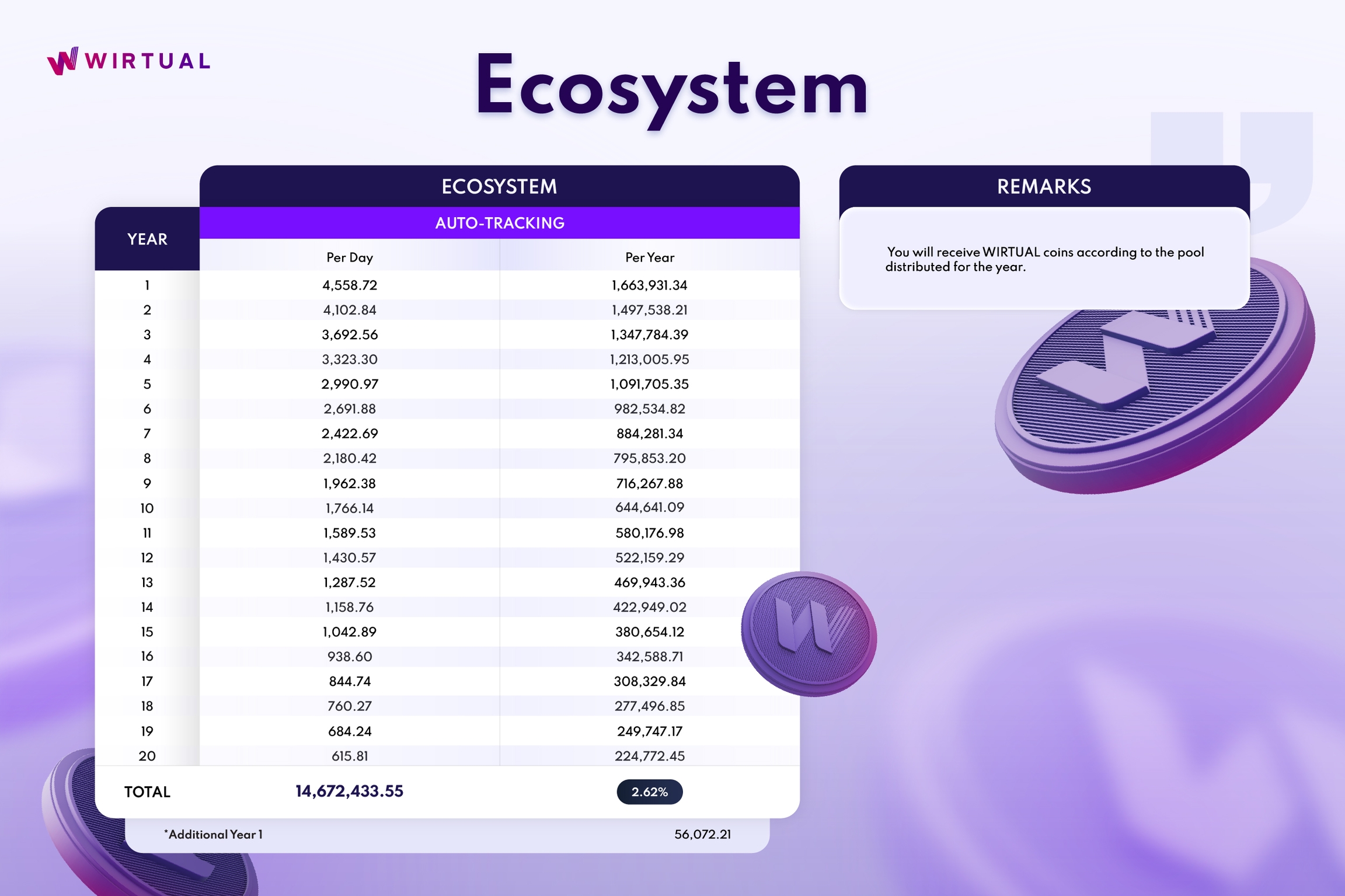ECOSYSTEM POOL ปีที่ 1: จำนวน 20,000,000 $WIRTUAL (ปีที่ 2-20 : ลดลง 10% ทุกปี)